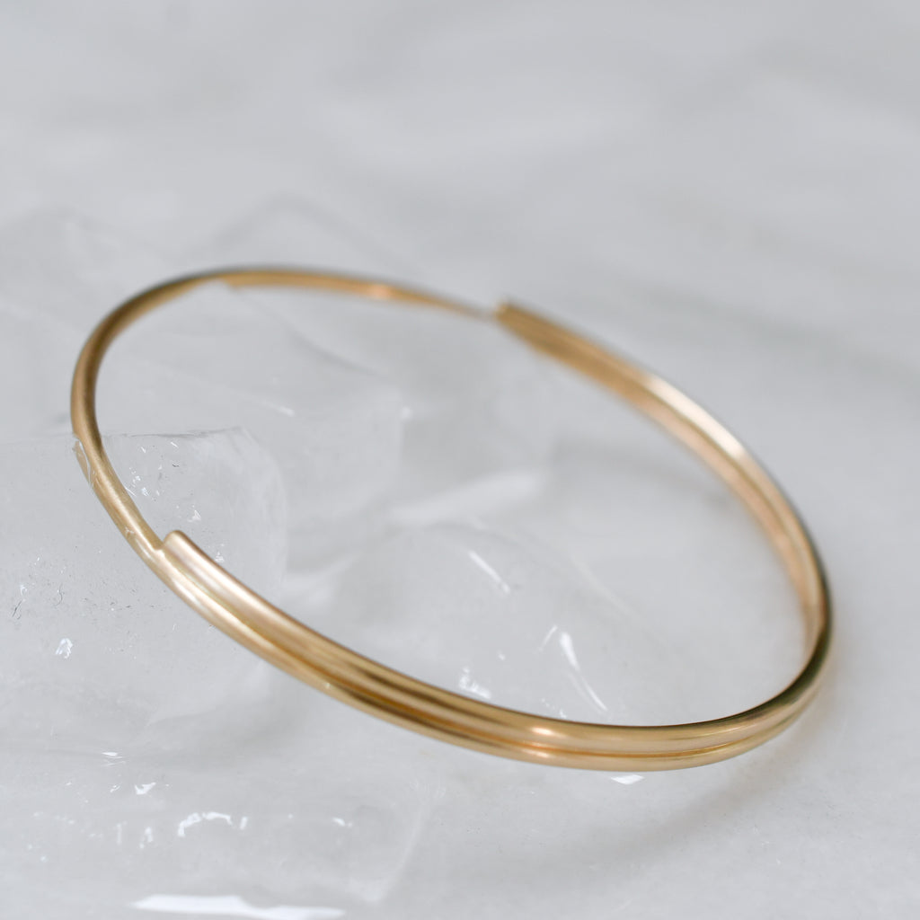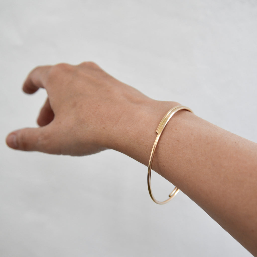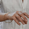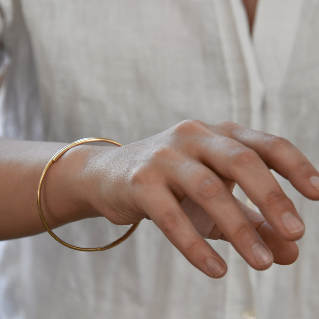 Inspired by the gentle rhythm of ripples on water, the Flow Bangle captures movement held in stillness. Two golden forms — one complete, one open — meet in a continuous curve, echoing the way waves overlap and dissolve. A quiet reminder of connection, motion, and the spaces in between.